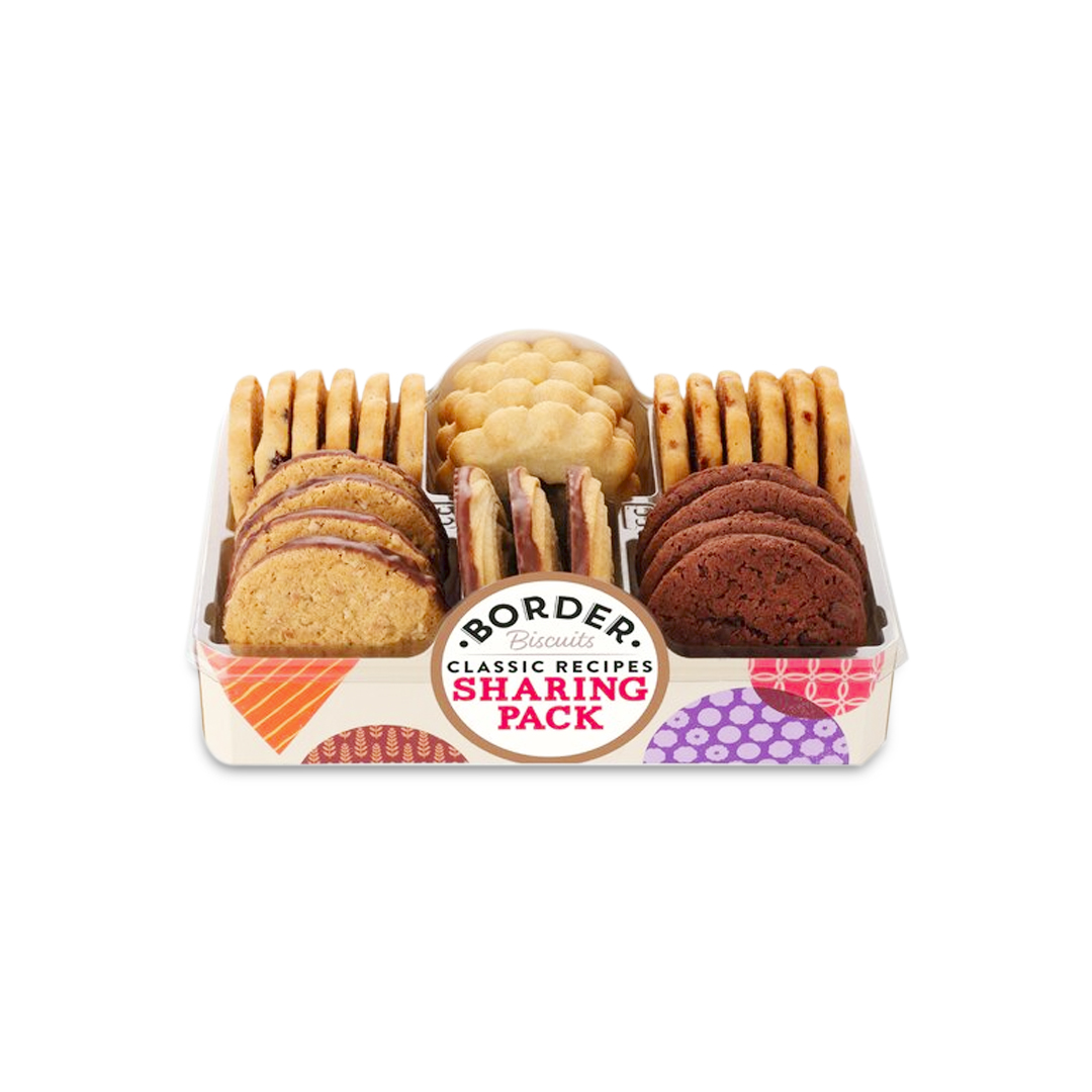 A share pack of Borders Biscuits. Branded with a full colour card wrap.