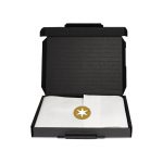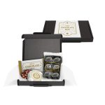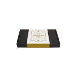 A slim black postal box, filled with x1 Silver Caviar Tin Chocolate Pearls, x1 6 Baton Milk Chocolate Bar and x1 Flow Wrapped Tray with our new signature cocoa bean chocolate truffles, wrapped in white tissue paper and sealed with sticker. A Semi Gloss Sticker to wrap the box.